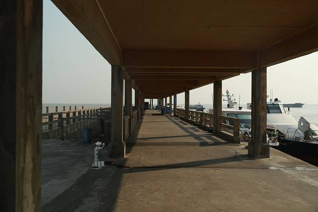 上午抵达台山市山咀港乘坐前往上川岛的船,眺望远方的海岸,川岛就在那边。