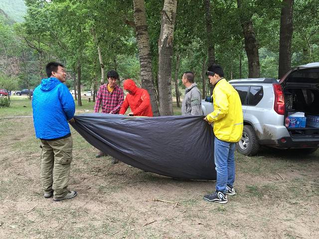 周六一早出发,中午抵达X404的入口,此时开始下起了小雨。不过这也不能耽误烧烤,聪明又有经验的帅锅们巧妙的搭起了雨棚,支起了帐篷。烤串吃起~~