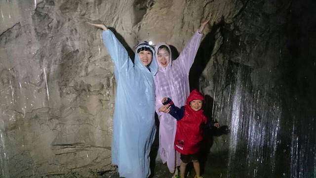 穿过吊桥继续往前,再穿过第7个隧道,就到了第8个隧道,这段行程中最刺激的“水帘洞”。换好装备,一路趟过清澈但冰凉的溪水进入岩洞,激流从头顶倾泻而下,之前带的所有东西都派上了用场。胡导强大的照明和防水手机给我们留下了这难得的合影。
