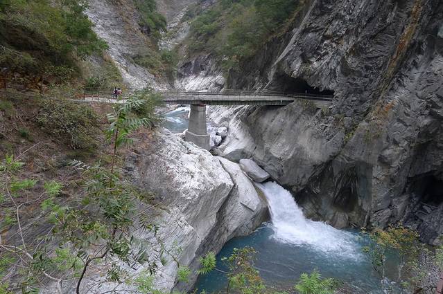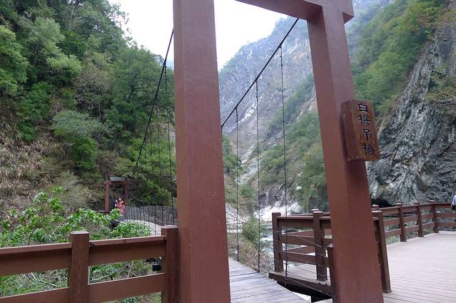 穿过第5个隧道后,眼前便是白杨吊桥。过了吊桥就是白杨瀑布(即当地原住民太鲁阁族人称的“达欧拉斯瀑布”,意为“高耸的断崖”),桥下奔腾的河水,就是立雾溪的河口。
