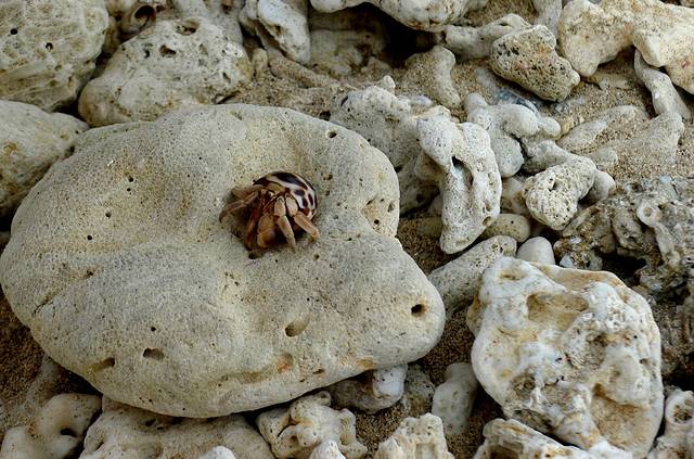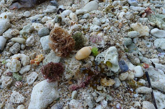 我们心心念念地又来到海滩上继续捡贝壳和珊瑚。胡导告诉我们,那些螺旋状可以钻进去的贝壳是寄居蟹的家,就不要捡走了。其他的,则可以痛痛快快地捡,只要拿得动。而那些色彩各异的海藻,则是绿蠵龟最爱的美食。