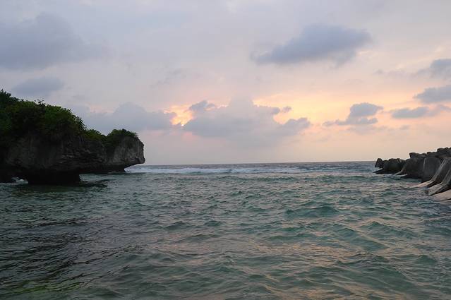 已近黄昏,潮水渐涨。海水的长期侵蚀,把岸边的珊瑚礁塑造成可爱的蘑菇形或美丽的女王头。海水一波波拍着海岸,瞬间就可以给你来个“从头到脚透心凉”,也引来在海边兴奋地捡贝壳的我们一声声惊呼。