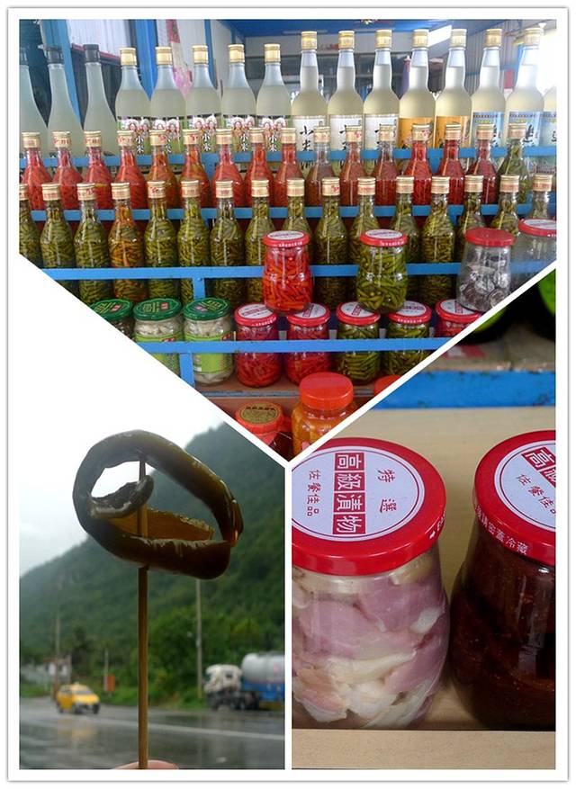 离开花莲,一路向美丽的苏花公路开去。经过著名的林妈妈剥皮辣椒。主人热情地请我们品尝,我们不买她也没有丝毫不开心。泡的生山猪肉引起了我们的兴趣,可惜没有人敢尝试。