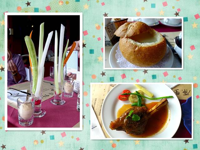 最有意思的是沙拉,造型独特,拿在手里吃,太特别了。汤里面有龙虾等好料,但不要吃太慢,外面的面包会漏的。羊膝是特色推荐菜,非常鲜嫩。