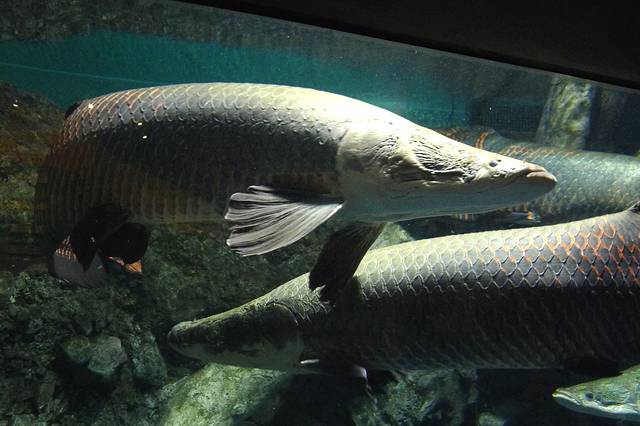 象鱼的学名叫做巨骨舌鱼,一看就知道是很古老的品种。正如它的另一个俗称“巨龙”一样,象鱼可以长到2.5米长,重量超过100公斤,是南美最大的淡水鱼类。成年的象鱼身体会渐渐呈紫红色,所以这两位都是前辈啦。