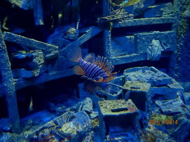 “沉船探幽”展示区模拟了海底沉船现今的状况,锈迹斑斑的船长室里满地是一箱箱珠宝,瓷器,剧毒的狮子鱼悠闲地游来游去……