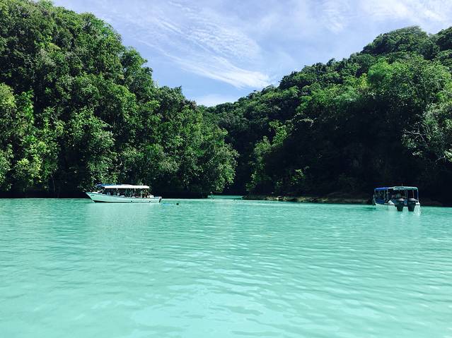 牛奶湖(Milky Lake)说是“湖”,实际上它是大海中一个小小的孤立海湾,三面被山环绕,留下一个缺口和外海相连。牛奶湖的颜色非常特别,是那种浅浅的天蓝色,纯净而美丽;在古代,这里是火山活动频繁的区域,火山喷发后的火山灰沉积湖底,经年累月,形成累积厚厚一层的火山泥。由于帕劳其他海域的海水都是百分之百的透明,而这里被称为牛奶湖的原因,是因为湖底沉积火山泥,水色带点乳白色的天蓝色,水质有点不透明,加上湖底绵白得火山泥很像牛奶,所以才被称为牛奶湖。虽然火山活动已经停止,但湖底仍渗出海底温泉,使得牛奶湖的湖水有淡淡的硫磺味,加上美颜的火山泥,美丽的“雕塑”含有矿物质,和海水中具有杀菌作用的微生物一起,变成了绝佳的纯天然护肤品。