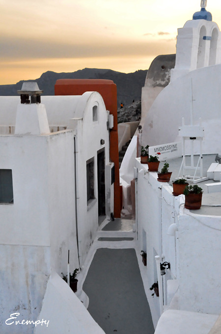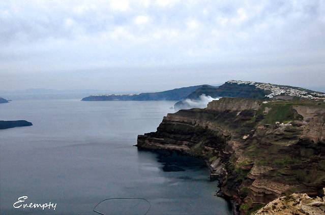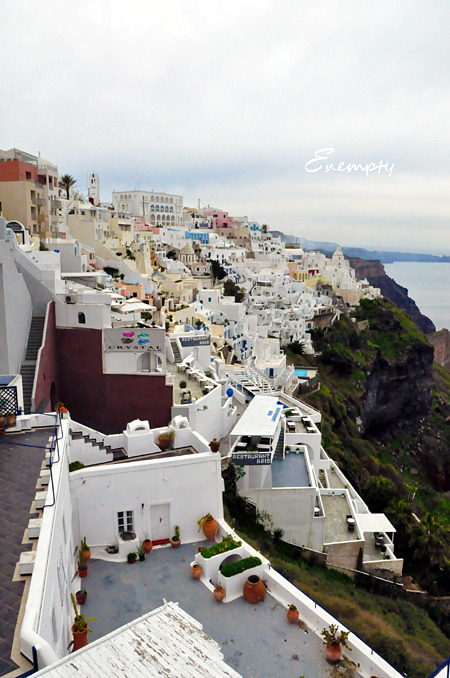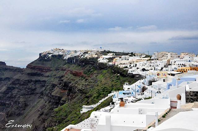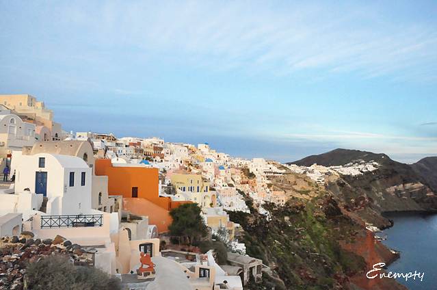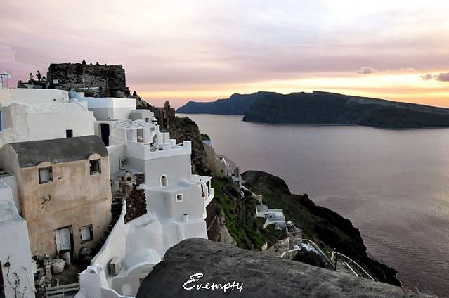 伊亚的日落 因为是淡季,出租车并不多,20多个人,只叫来两辆出租车,地陪叫了辆大车,收了我们一人30欧,说是可以从费拉送到伊亚,真你妹黑,虽然知道被黑了,但是也给去看啊,也幸好去看了,之后两天的天气都不怎么地