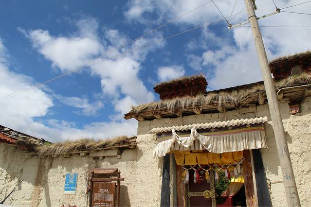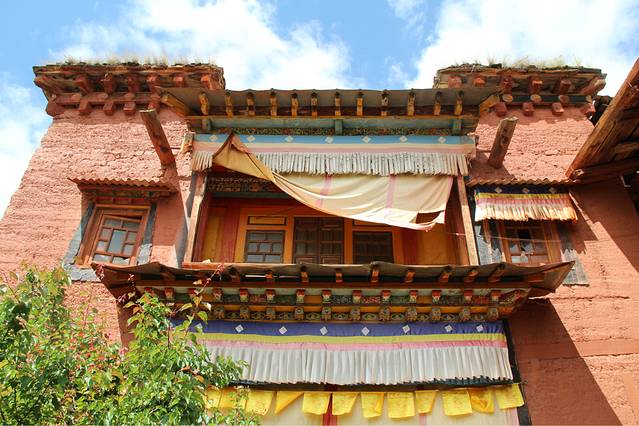 红砖蓝天还有七彩的经幡,在阳光下映衬地格外明朗