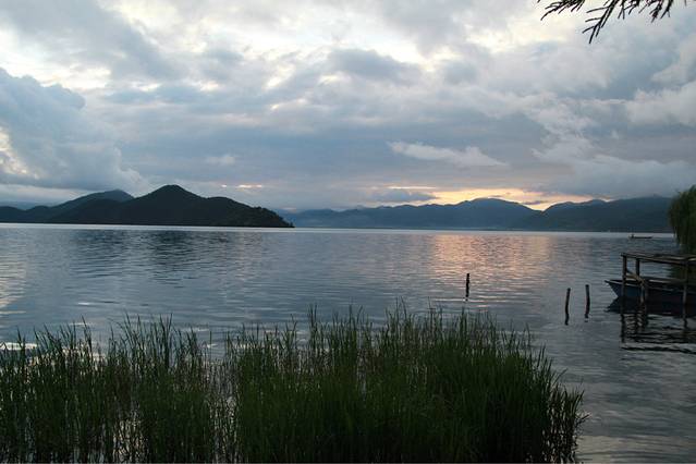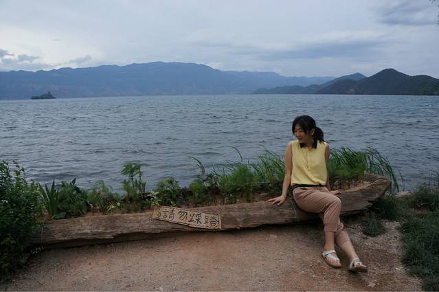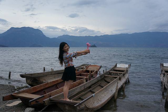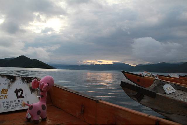 第二天,我们就准备再返回丽江,一大早,拉开窗帘,发现一道金光,虽然没有很强烈,但对于刚起来的我来说,就如同在梦里一般,于是我变稍微整理了一下,不管仍在熟睡的小伙伴,把她们叫起来看这所谓的日出,然后我一个人背着相机出去体验了一把。。。虽然。。。真的有点坑爹。。。天气不好,但是,看到一些很开心的游客在那边嚷嚷,拍照,还有像我一样,一个人出来感受这早晨泸沽湖安静的美好的游客。我在猪槽船上坐了一会儿,看着这不大不小的金光,也不想动弹。