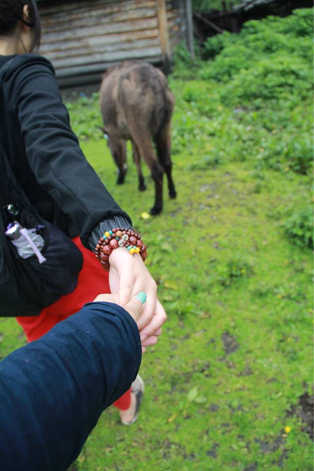 走在湍急的河流旁,又是没有见到一个人的节奏,不知怎么的,我总是走在最后一个的节奏,终于在一个小桥上看到一个人影,我激动地和他打招呼,可他都不鸟我。。。略伤心。。。等他走到我们身边的时候,他却主动和我们说话了。一个笑起来很和善的男生。问我们是不是去冰湖,哎~谁知道能不能走得到呢,我告诉他不一定,怕回去的时候天黑了,可能就走不到了吧,和他交流了一会儿,他告诉我他今天刚从冰湖回来,去那儿放牛,他还问我们是不是很真的想去冰湖,我说是呀!他很热情地说,不会天黑的,天黑之前肯定回得去,并且亲自带我们过去诶~~~~泪奔了好吗!!藏民为什么这么好!!