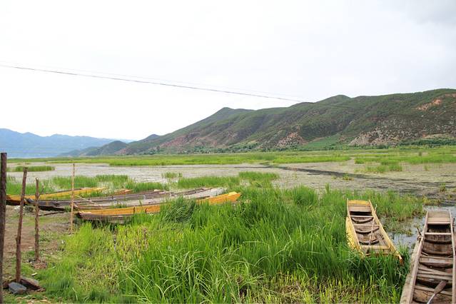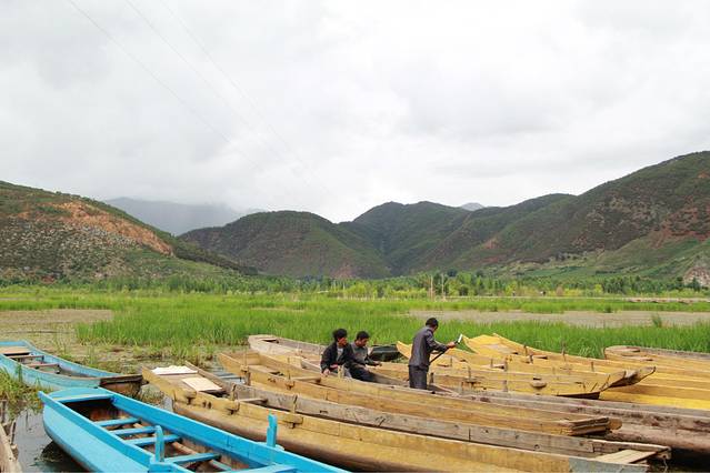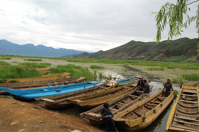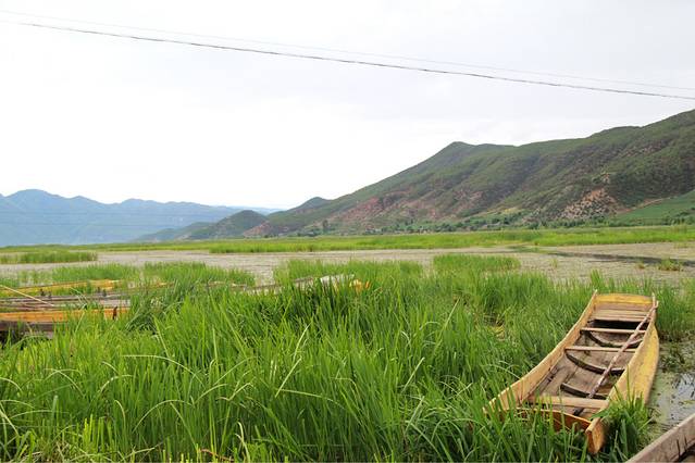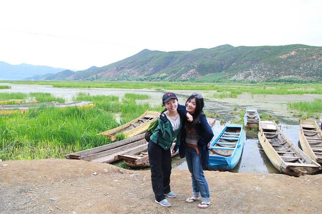 终于,我们又骑到了一个地点——草海。其实还是蛮美的,大片大片绿色的草从湖中生长出来,还有一些猪槽船在当中做点缀。。。在岸上还有很多摩梭人。。。看到我们停下来拍照,还问我们今天晚上还要不要走婚。。。哈哈哈,我可以观摩一下嘛?