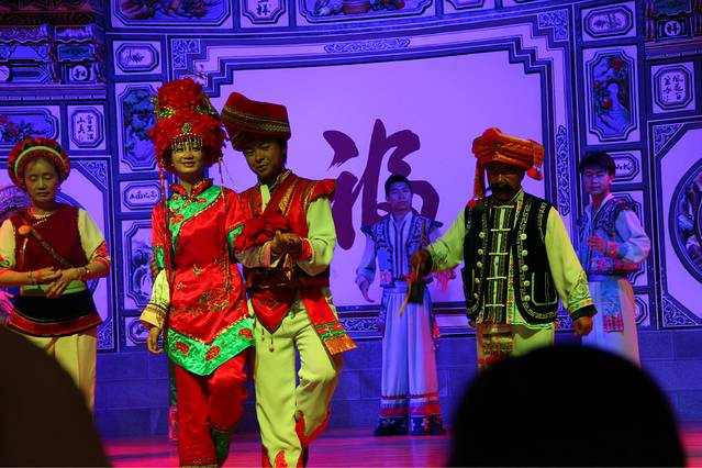 白族结婚时有掐新娘的习俗,在表演的最后新郎带着新娘来到观众席被掐,掐的越多得到的祝福越多,自然也就能更加幸福啦!!