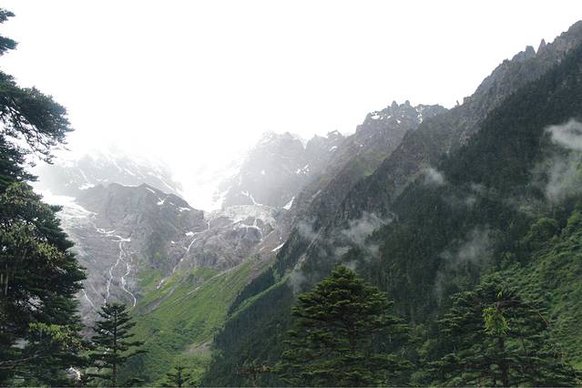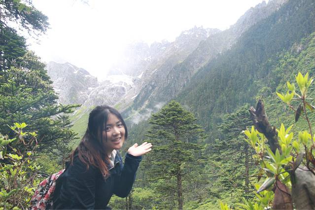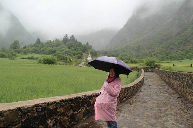 天一定来不及去另一个景点,神湖,来回可能十二个小时都不够,尤其我们这种还不认识路的人,冰湖,来回七八个小时,一路风景胜过这个景点。所以初步定下来,我们三个妹子准备只身前往冰湖,第二天早上出发去神瀑,沾沾神气,然后下午从尼农这条线出发出雨崩村到飞来寺去。 雨下很大,基本每个人都在格桑家里买了雨衣,质量不错,也略贵,于是我们带着从雨崩村外买好的干粮开启了三个妹子的奇幻旅程~一路上没有任何标记,没有指示牌,就连人都少的可怜,一开始还能偶尔碰到一两个,听说我们要去冰湖,都一副我们好厉害的眼神,其实我们也就想随便走走,能走到最好,不能走到就欣赏一下沿途的风景,谁叫他们都说去往冰湖的路上,风景胜过景点呢~