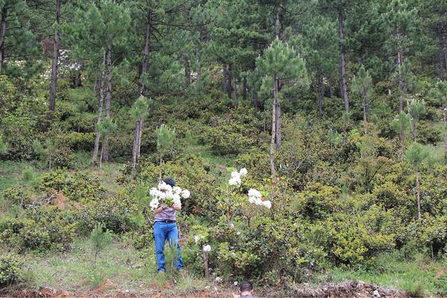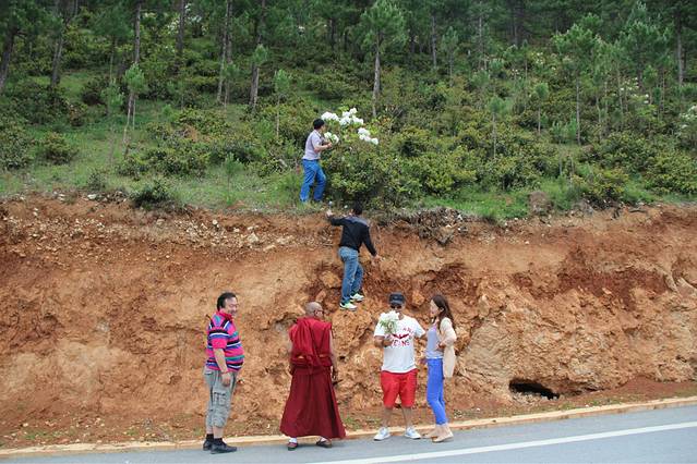 在路上,他们发现了再山边的高山之花——杜鹃,白白的,不禁停下车,不过之后的行为并不支持啊。。。一大哥爬上去摘了。。。虽然很美丽,很纯洁,但是。。。总觉得是种破坏啊。。。