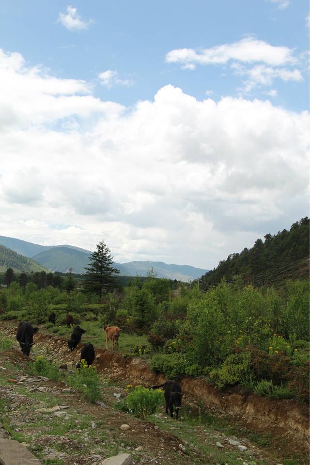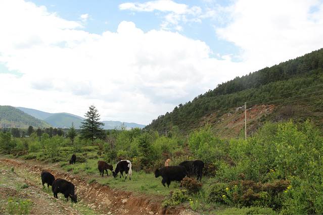 车行驶在蜿蜒向上的公路上,从丽江到香格里拉的公路修的挺好的,只是慢慢海拔越来越高,我也有一些小小的头晕,在路上的小牦牛。