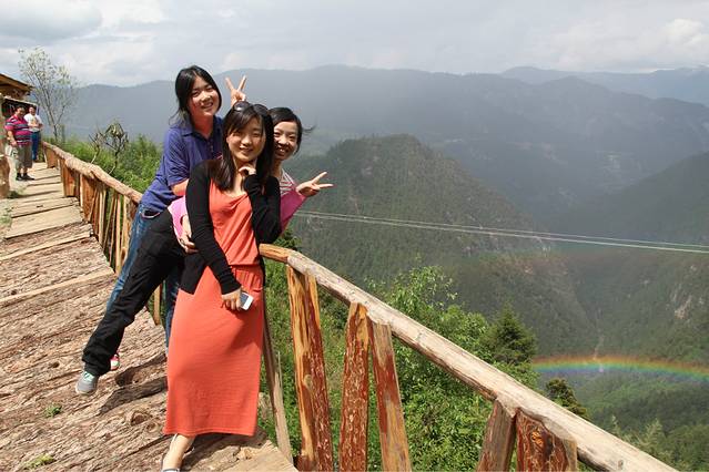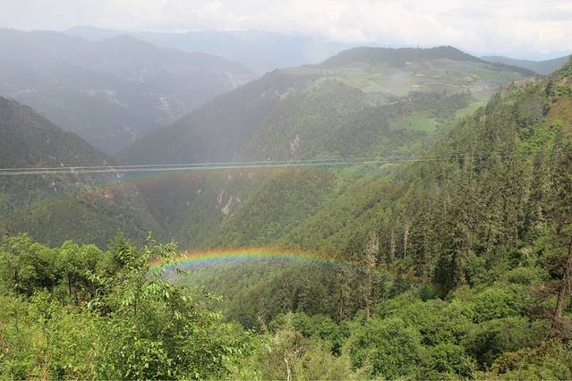 在车上说叨着双彩虹,结果,在路上聊天的时候杨大哥(他们中间最有号召力的一个大爷。。。也是最有money的那位。。。)说到双彩虹来着。。不要说双彩虹了,就是单单的彩虹,我们这些生活在城市里的人都很少看到过,至少我没有在我生活的城市看到过。。。我记得唯一一次看到的是在凤凰的苗人谷,那里的小瀑布,从上往下看,有一个小小的彩虹,用相机还拍不出来的那种。结果,在去高原的途中下起了小雨,香格里拉的蓝天并没有给我留下深刻的印象,倒还不如丽江来的纯粹,但云南的天气就是这么奇怪,前一秒还乌云密布,后一秒立刻放晴,正巧到了一个观景台,杨大哥把车停下,所有的汉子都下车了,我们也下车,一不小心就看到了这充满了幸运味道的双彩虹!!这对于我们这些从钢筋水泥的城市里出来的孩子来说是有多么稀奇啊!!!赶紧拿出手机相机狂拍一番!真是Sooo lucky啊!这番神奇的景色出现在我们遇到这群有爱的大哥之后,分享到微信上,让大家都沾沾福气吧!嘿嘿
