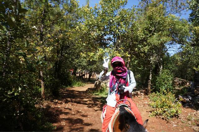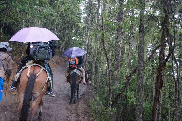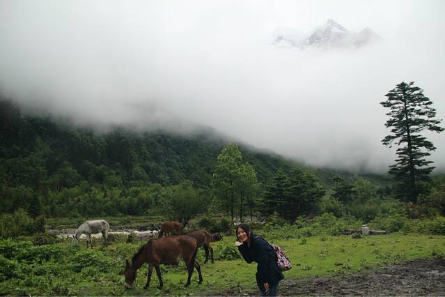 到了景区门口,现在的雨崩不是单独售票的了,它包含了冰川、雨崩、飞来寺和雾浓顶好几个景点,学生票也是100多,真是会做生意,本来就去个雨崩,还搞那么多花头出来。那一天很多喇嘛都到了雨崩,听说是一个什么活动来着,忘了,门口的小帅哥让我们在门口等等去西当温泉的大巴,不然走到西当可能又是三四小时,从西当到雨崩村又是六七个小时,徒步的考验就此开始了。。。不过真想说,藏族男生怎么都这么耐看啊~无论是在丽江的小帅哥,还是阿布,还是这个门口的小帅哥,都长的好有味道,好帅啊。。。哎!小帅哥挺好的,每次都车进进出出,他也会替我们留心,帮我们问能不能搭我们三个去西当,还给我们指导,应该怎么玩才合适,哪里危险,哪里美丽。后来我们搭到一个大叔的车,到了西当温泉,果然路上还是有一段路的,而且路非常不好走,太阳直射,幸好有车能搭。。。到了西当,已经下午三点了,又下着小雨,再负重走到雨崩,我怕我们三个妹子会受不了,于是,就启用了plan B ,骑骡子上阵!骑骡子到垭口,每匹235好像,而且依据大背包的重量另外算负重的重量,对于我们一路搭车的驴友来说,价格略高啊!Anyway,今晚能到雨崩才是王道!