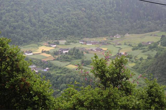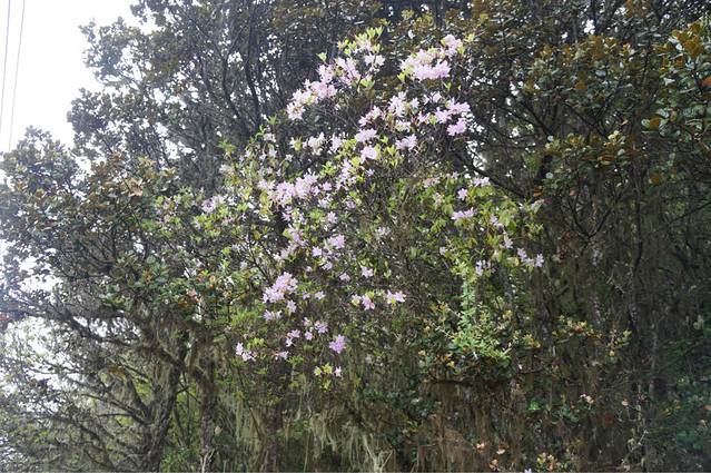 骑着骡子,我们慢慢悠悠地开始了上坡的路程,路上偶尔会碰到几个出村的人,我记忆特别深刻的是一个单独下山的中年妇女,我们问她村里景色如何,顿时,她就笑开了花,纵使出村儿的路再困难,想到雨崩里的景色,真是如梦如幻,那也就值了!不得不说,越往上走,天气越冷,我的同伴都冷得拉肚子了,艰苦的条件迫使她只能就地解决,带我们的当地阿姨也说附近没有厕所,只能就地解决了。。。其实骡子的速度也没有很快,挺后悔骑骡子进村的,我们是低估了自己作为女汉子的实力。。。到了垭口就开始了近一个小时的下坡路就能到上雨崩村,我们开始了接连几天的徒步之旅。在这里,终于能见到大杜鹃花了,那雪白的一朵朵,多么纯粹!