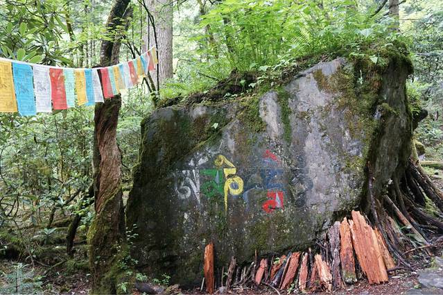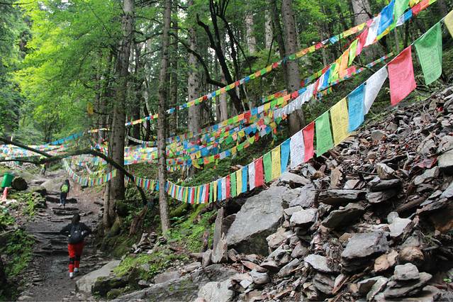 走在原始森林中,一路都是这样的经幡,比起昨天前往冰湖的路上,一看人气就旺了许多,经过昨天的锻炼,觉着,去神瀑的路真的是小case啦~~