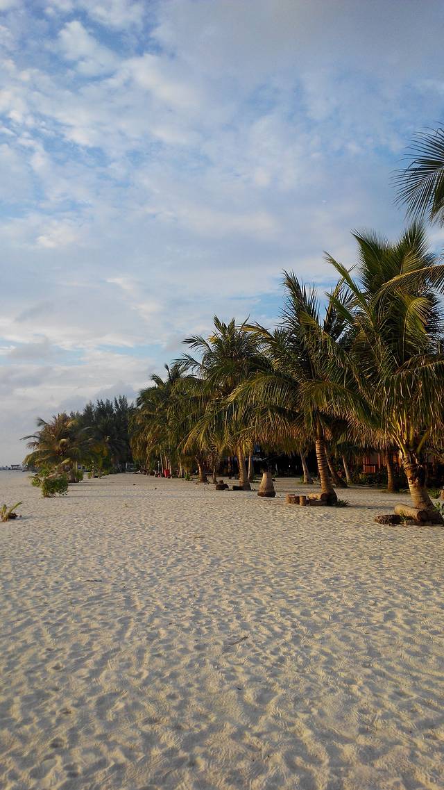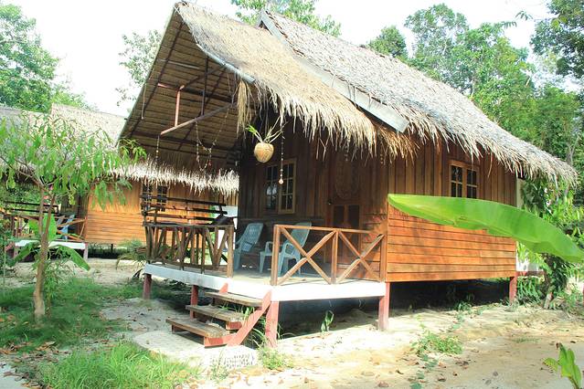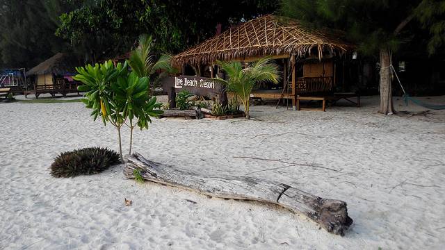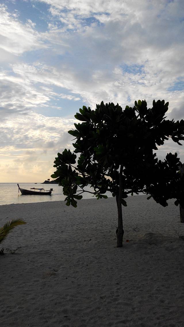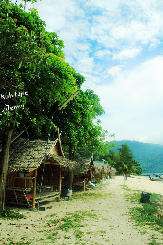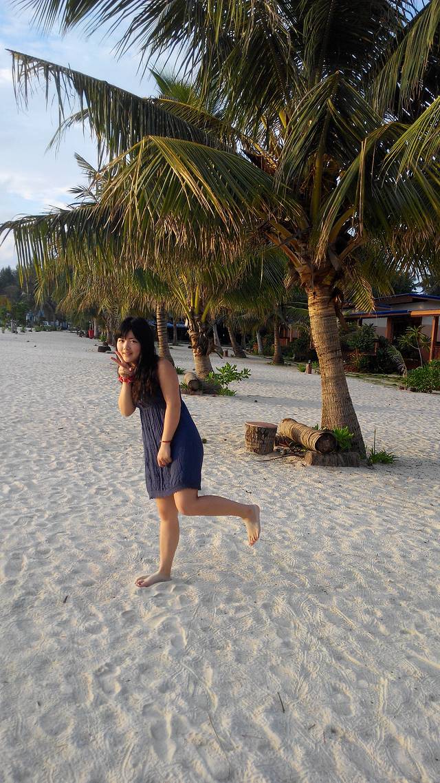 可是,一下子我们也没了方向,没有在网上订住宿,只知道这个岛很小,有一条步行街,然后什么都不知道了。一个当地的taxi司机带着我们还算听得懂的英文来问我们去哪里,我们说不知道,他问我们房间是要电扇还是要空调,我们分别询问了价格,房间with fan是800,with air-conditioner贵几百,具体忘了,他说房间能住3个人,这样算下来其实比我们当初设想的要便宜很多了,让他带我们去了,一个人50B的车费,去了Sunset beach,看了房间,小茅屋,门口都是树,草,蚊子很多,虽然面对着大海,但是为什么总让人高兴不起来呢,我们同学的爱疯手机根本收不到信号,可我的happy 卡还是比较给力的,一路上都有信号,而且蚊子特别多,房子加1个人变成了1000的价格。稍微弄了弄行李,顶着太阳出门随便逛逛,虽然BOSS给了我们地图,但我们还是不怎么认识,好歹也是SUNSET BEACH,来两张照片先。