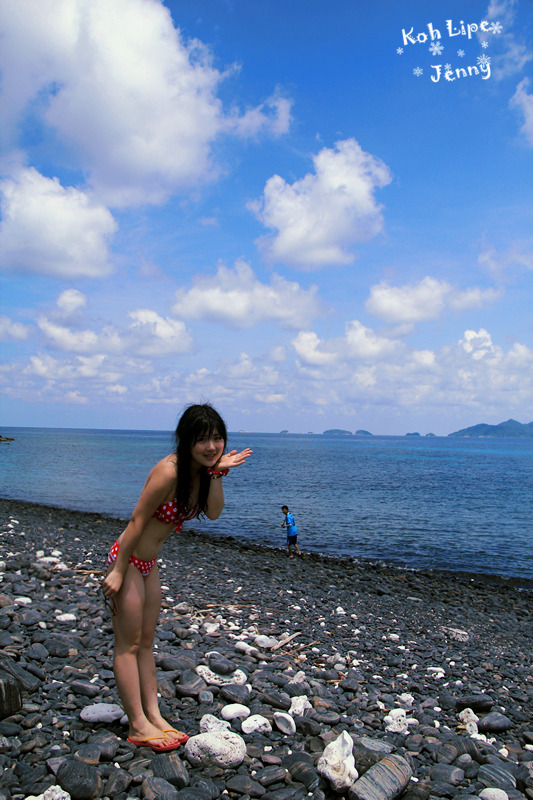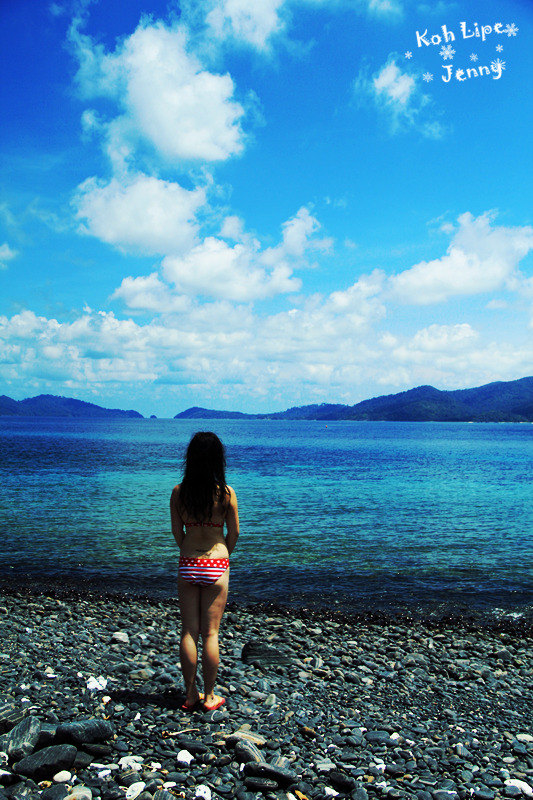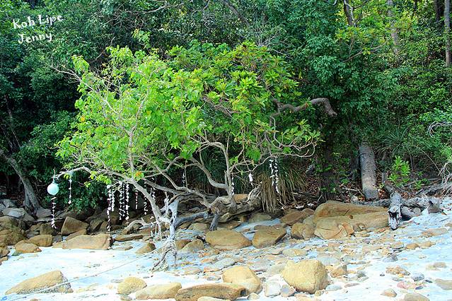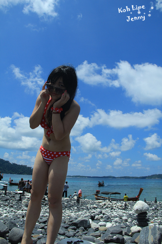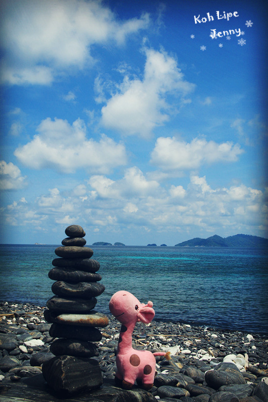 很多这样用石头堆砌起来的石堆,以前在云南的雨崩看到过很多,当地的藏民说这是一种类似于祝福祈福的方式,叫尼玛堆。但是我不知道在丽贝岛上,这个叫什么。我们几个就顾着拍照,我就堆了一个很小的,太晒,只要停在那边我就觉得背部在灼烧,等我们上船的时候,泰国爷爷问我们有没有堆,他很自豪地指着很高很扎实的一个“尼玛堆”告诉我们那是他堆的,那也是一种自豪感。