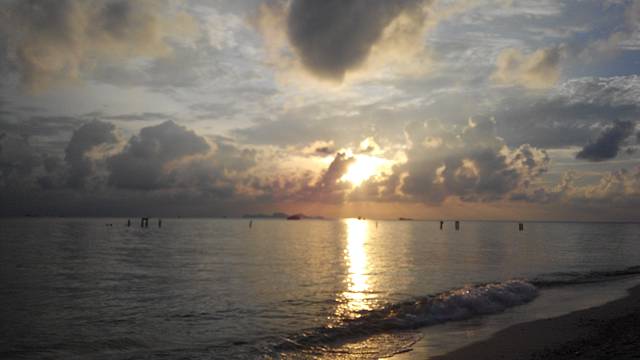 事实证明,在海岛要看日出真的一天都不要浪费,第三天,朋友大吼一声,我去,已经五点三刻啦~~赶紧换件衣服直接到海边看日出去,可是云层很厚,一点都不像我前一天在这个时候看到的绚丽,一直到55分,太阳的光芒还是照不开那一群厚厚的云层,直接回去倒头就睡了。。而第四天也差不多,虽然云层没有太厚,可是还是不如我第一天看到的如此扣人心弦。