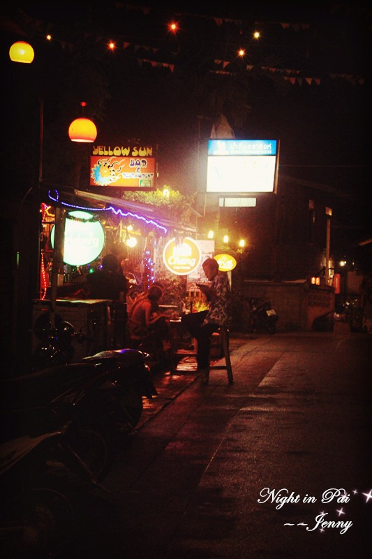 晚上,我们本想去sunset看日落来着,可是那天没有日落,可能去的太晚了一点吧,没事,还有一天,我们不着急,慢慢来。就在从sunset回sunrise的路上,我们终于碰到了一对来自重庆的中国人~真心不容易,我们一路结伴去步行街,得知她们住在pattaya beach,也是我们还没有去过的一个beach,由于和泰国红灯区芭提雅同名,所以总觉得应该是个比较喧闹的海滩,我们一起走到步行街,看到7-11,还看到很多吃的喝的,找了一家店进去喝一杯果汁,COCONUT是比较清新,毕竟是海岛,东西的确比清迈贵,清迈20B一杯的果汁在这里要卖80B,但是就这样折成RMB,还是比我们的鲜榨果汁便宜呢~~NICE!~在步行街的路上,我们还碰到了中午的那一家马来西亚人,果然他们刚吃好东西,在逛街,看到我们疼的要死的脸,他建议我们去7-11去买一支芦荟霜涂在患处,否则明天会更惨,我们听了“当地人”的话,买了芦荟霜,想慢慢走回resort,可是。。。晚上我们都成了路盲,不知道怎么,我们以为我们走到了sunrise,但结果。。。我们却走到了pattaya。。。。。无语啊。。。看到pattaya上的节目是比较多,有耍火的泰国小哥,有稍微HIGH一点的music,我们一直走到海滩的尽头,准备翻越石堆,来了一个工作人员,问我们住哪里,我们说sunrise,他说这里是pattaya,看着我们错愕的表情,他笑了,然后给我们指路。。。。当中有一个小插曲哦~~因为在岛上真的是找不太到什么厕所,我同学想如厕,可是回程路漫漫,我们说要不就入乡随俗一下算了。。。刚说让她在石堆隐蔽处那啥,她刚那啥,就看到两个人过来了,赶紧站起来,跑到另一边去那啥,可两个人还是往她那边走,我真的是笑死,no zuo no die ,no more try。然后人家过来说this is not toilet.......哈尴尬。。。也真的是记忆深刻,然后走着走着,我另一个同学直接性躺在沙滩上了。。。。。被沙滩上人家挖的坑坑了。。。。真是笑点太低了。。。anyway,虽然波折,但是我们还是回到了原点。