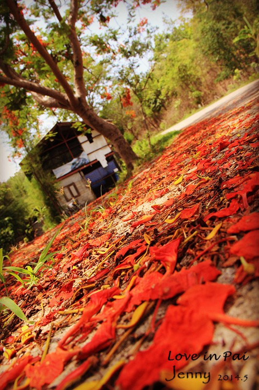 橘色的花瓣,橘色的公车,形成美丽的一道风景线。