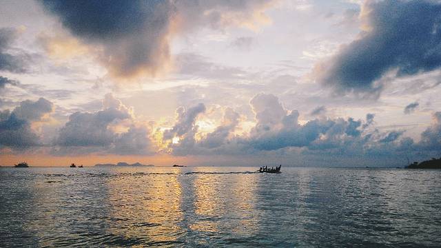 而海上的日出,一个人,虽然不是很动感,但是这安静的让人觉得特别舒服,再往前走走,能看到一些当地人直接性就睡在沙滩上,放一张毯子,还有一些人已经起床,开着凸凸凸的长尾船准备出海捕鱼了。