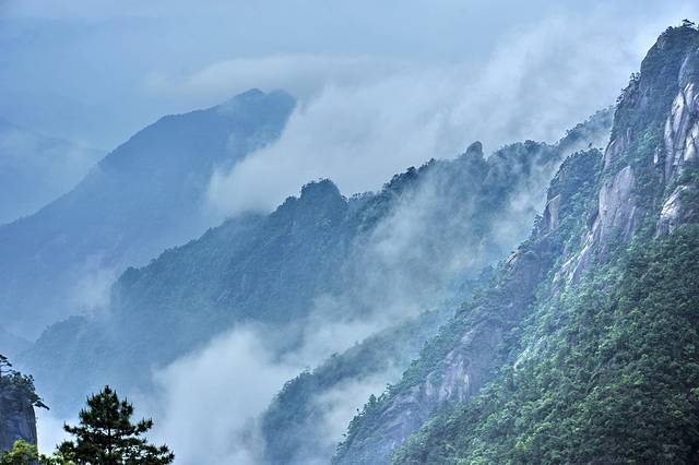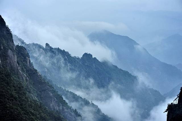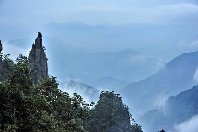 一反昨日的阳光明媚,朦胧的云雾给三清山围上一袭欲语还休的面纱。群山飘渺,如诗如画。