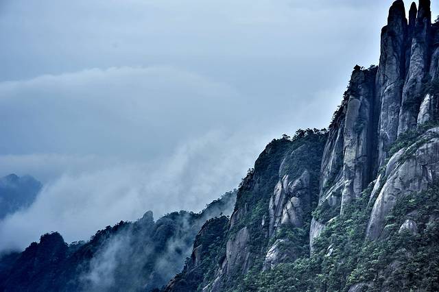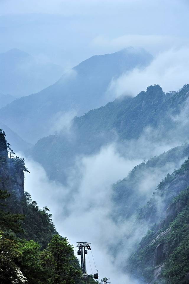 云海雾涛是三清山四大美景之一。欲赏美景,需登高望远。我们从日上山庄出发,攀爬最为陡峭的天梯,清晨的雨雾一路在我们的身边缭绕。拾级而上,气喘吁吁,不时的停下脚步,回望远近的山峦,在云烟里若隐若现,恍如行走仙境一般。