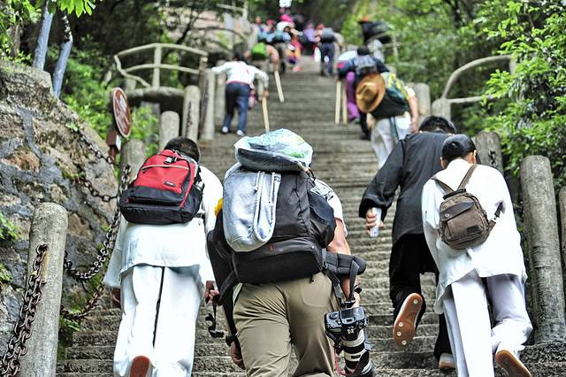 背负着行囊的登山客们不懈的攀爬,通过拥挤的一线天后,离最高处的玉台就不远了。