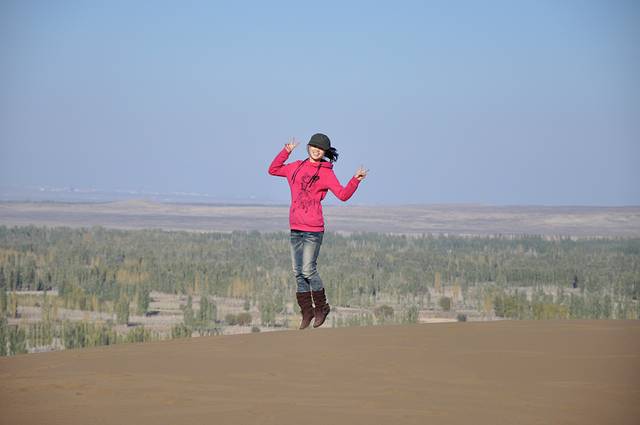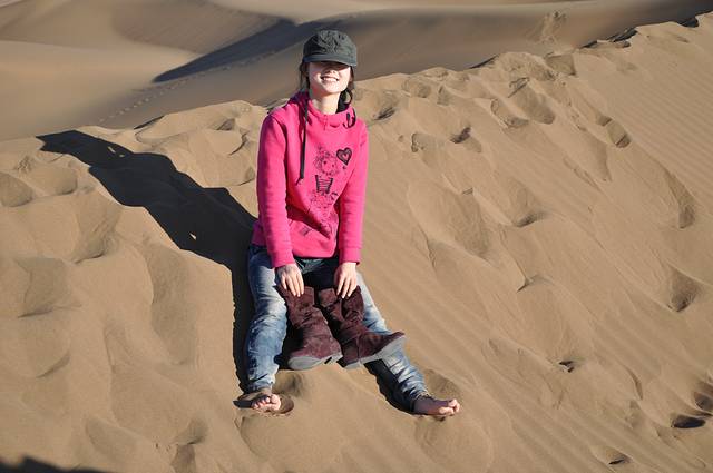 十月的沙漠就是到了中午也不会觉得热,直觉温度刚好,这是我第一次真正意义上见到沙漠,他是那么的浩瀚,像大海一样,俨然就是一片沙的海洋;第一次和他亲密接触,我脱掉了鞋子光着脚丫子在上面漫步,竟会有一种比踏浪更浪漫的感觉,我是如此的欣喜,我来到了这片沙的王国。