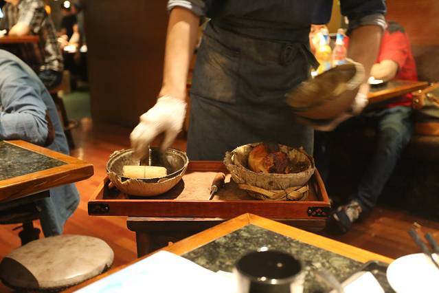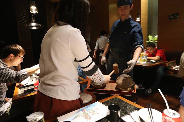一个上菜的小二哥一路小碎步端着菜走到我们面前,然后给出一个锤子,让我们敲,随着我敲的三下,小二哥的嘴里也顺势说出祝福之词,这上菜的方式,噱头十足啊~