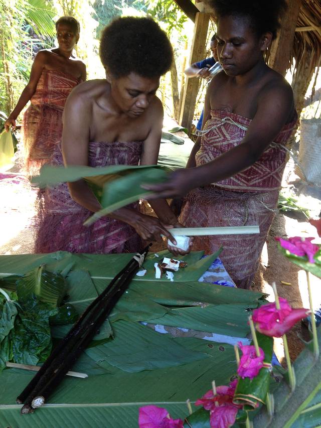 在做他们自己的年糕之类的食物,是他们的主食,用的是木薯,他们没有刀,用刚劈下来竹子当刀用。