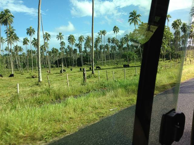 这个应该算是热带风情的农场吧,牲口在椰林之间游荡。