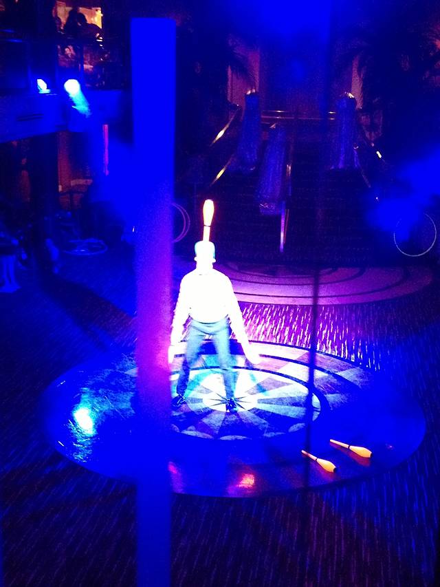 吃完晚饭无聊可以去看看表演,船上带了个杂技团,下面这哥们学了中国杂技,顶缸都会的。表演的十分精彩,用西方幽默诠释中国杂技。手机拍摄,请勿吐槽。