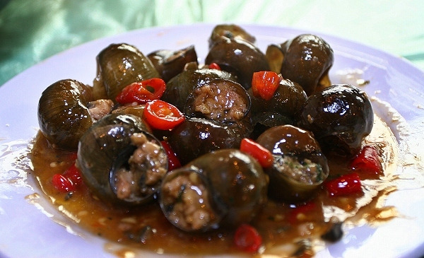 螺蛳酿,将螺蛳肉、鲜肉还有薄荷拌在一块酿到螺蛳里,香滑爽嫩。