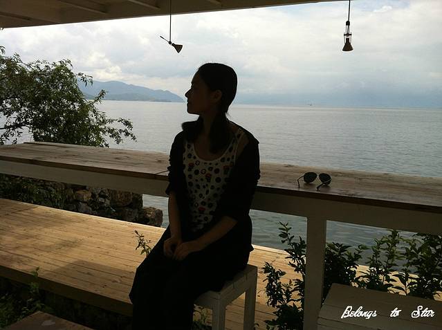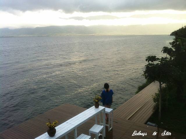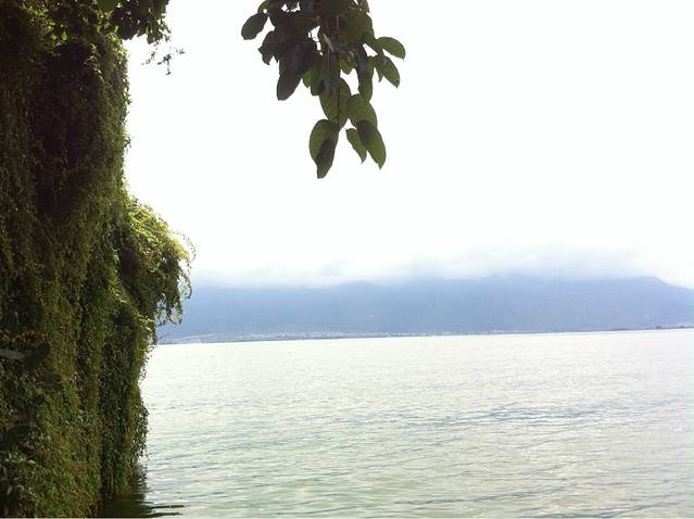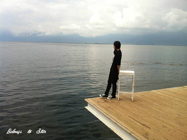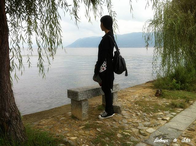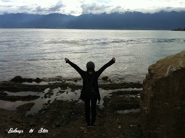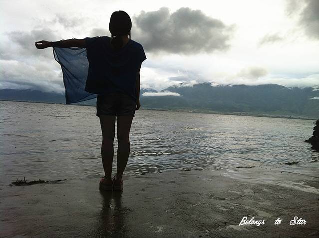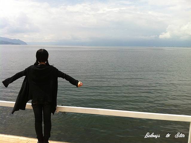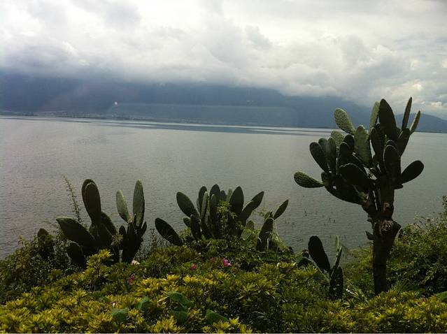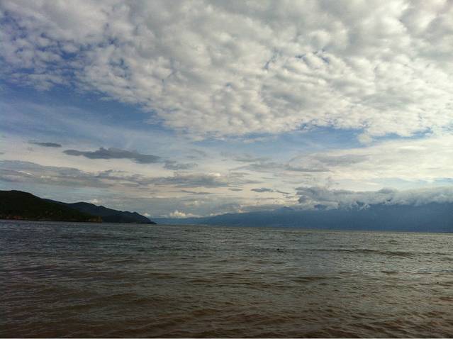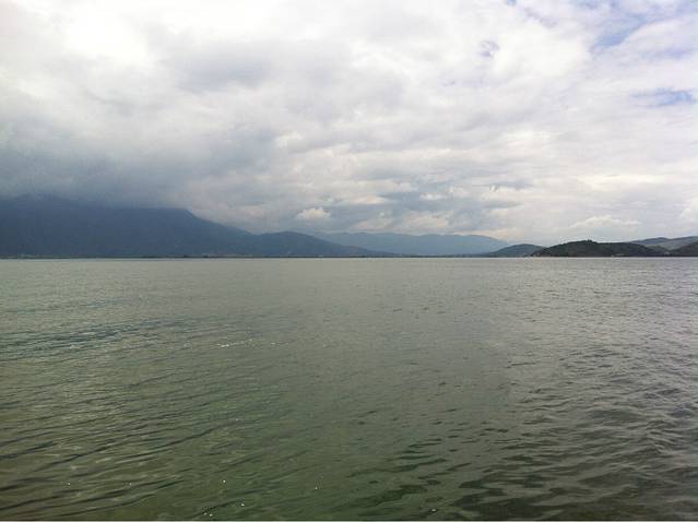 我们在江尾下车时雨又开始下了,一下大巴就有面包车去双廊。因为泥石流封路我们得绕路,所以包车车费涨到40元。一路沿着洱海前行,天气时晴时雨,我的心情却不断明朗。在还没到双廊的一个沿海转弯处,师傅停车给我们照照相,尽管云压得低低的,但离开丽江看见这样开阔的景色的确让我兴奋不已。这就是我千思万想的洱海!