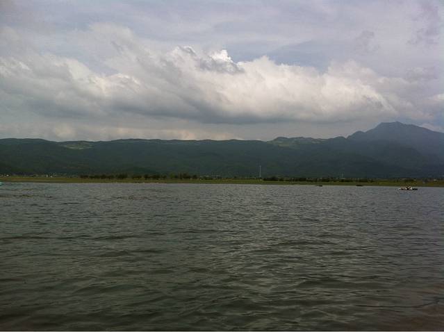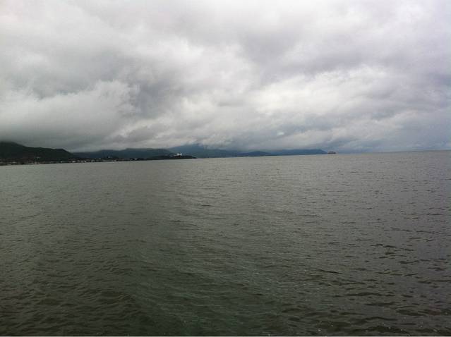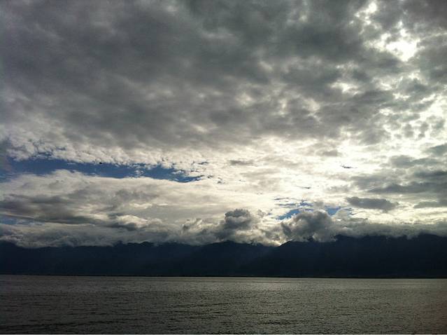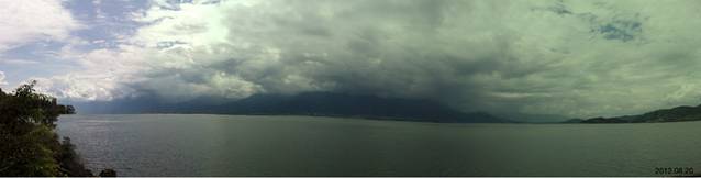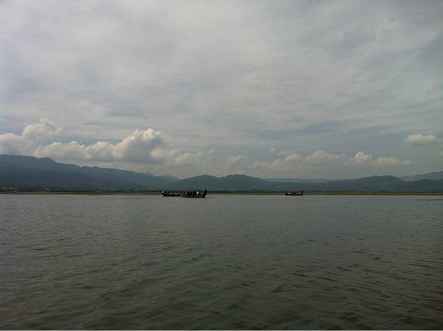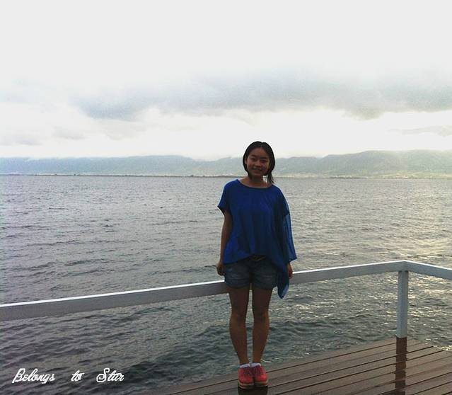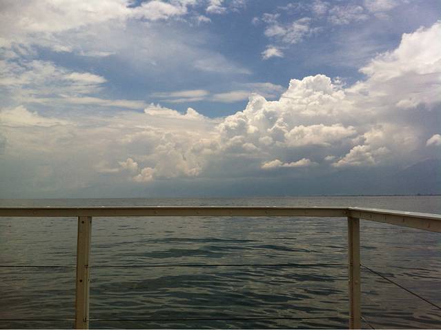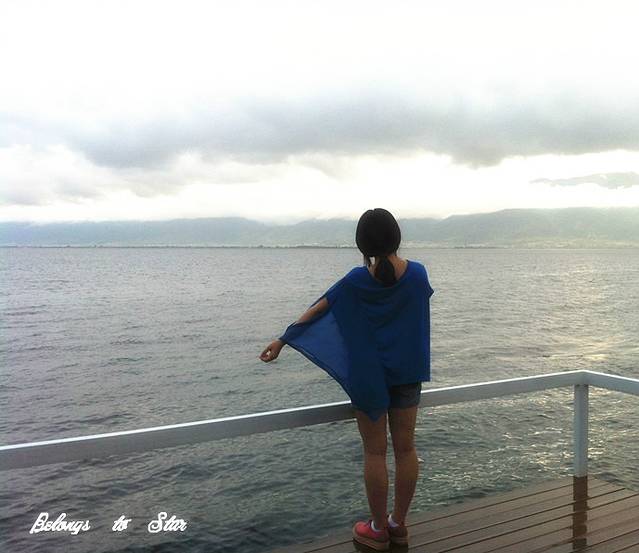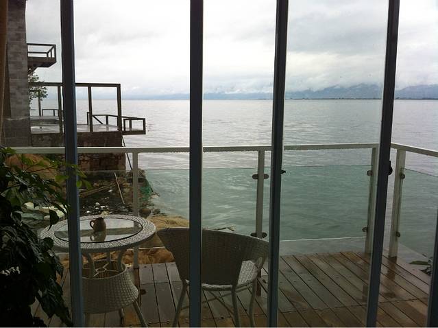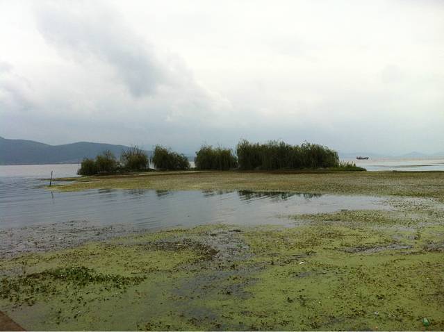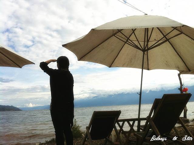 我们在江尾下车时雨又开始下了,一下大巴就有面包车去双廊。因为泥石流封路我们得绕路,所以包车车费涨到40元。一路沿着洱海前行,天气时晴时雨,我的心情却不断明朗。在还没到双廊的一个沿海转弯处,师傅停车给我们照照相,尽管云压得低低的,但离开丽江看见这样开阔的景色的确让我兴奋不已。这就是我千思万想的洱海!