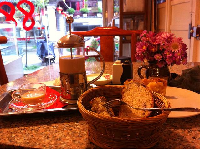 放下行李后租了一辆自行车前往博爱路的“Bakery 88“——一位德国老太太开的西点店,我就是冲着这去的。嘿嘿,对于德国总有说不清的亲切感。不过价格的确不低,这顿早餐真是奢侈T T,但是他们的印度奶茶真的好好喝。