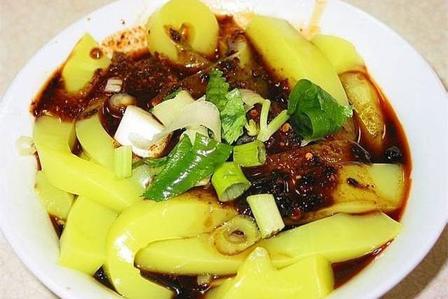 康定凉粉,以黄凉粉称著于世。许多久走四外的人品过各地凉粉,相比之下,还是说康定凉粉好。凉粉筋丝好,切得四棱四现,厚薄均匀,且粉丝光泽发亮,筷拈不断。特别讲究红油,盐酱制作,调入凉粉,食者一拌,麻、辣、香、柔、嫩,可口极了。食者络绎不绝,尤其春夏郊游,不论藏、汉、回人都要买去作上品,以佐野餐。