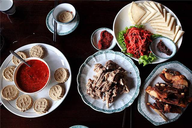阿热盖被是阿热藏餐的招牌菜,吸引到不少回头客。盖被是藏餐里的景点菜式,面饼铺在肉块之上,在佐以辣椒、土豆和洋葱等配餐,热气腾腾的一大盆,足够两三人的食量。