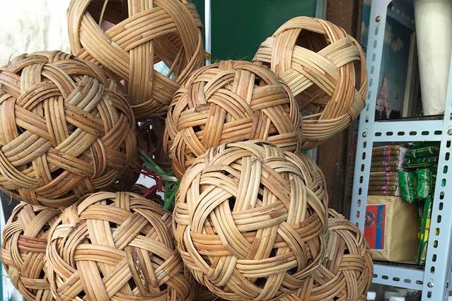 竹编小足球是缅甸人热爱的一项传统运动。这种足球直径约为成年男子手掌宽,十分轻巧,玩法与中国的毽子类似,不论多少人都可以玩。当地人一般5 人一组,两组进行对抗赛,中间有类似羽毛球网的小网作为分界。竹编小足球可算缅甸特色的纪念品,仰光街头玩这种足球的人也是随处可见。价格3,000 甲。