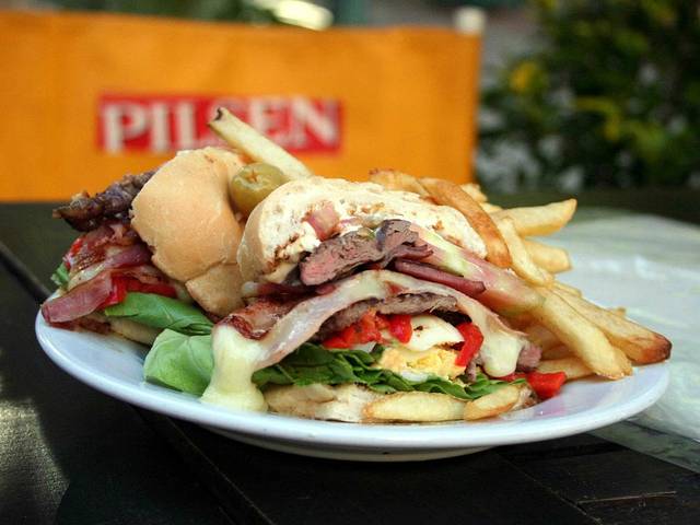 大香肠三明治的主要成分为Chorizo 烤香肠,是一种烤肉的前餐。由碎肉所组成,外皮被架在烧烤上面烤至微焦的颜色,夹着法国面包吃就叫做Choripan,里面可加Chimichurri,吃起来更加香辣,是阿根廷典型的路摊食物。而一般卖Choripan 的小摊子上都会卖Bondiola,是把猪肉切成片,叉到烤架上面去烤的一种三明治,里面夹著生菜番茄和一份煎蛋,秘诀在於把简单的蛋黄液搅拌,混在肉片上一起吃。加一点Salsa Criolla,酸辣美味。