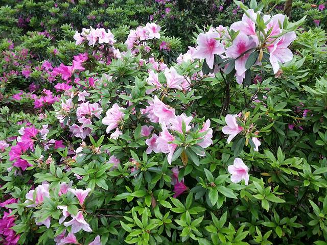 到了山边,杜鹃花更是疯狂地成了山的裙裾,恣睢地织成了七彩的锦缎。想象不到,杜鹃花还可以有这么多的花色,褐红的、粉红的、紫红的、浅红的、橘黄的、粉白的、纯白的……这里是杜鹃的疯狂世界,此时是杜鹃花恣肆怒放的时节。