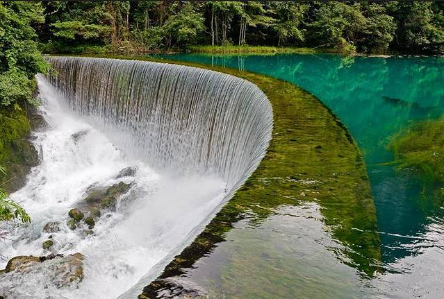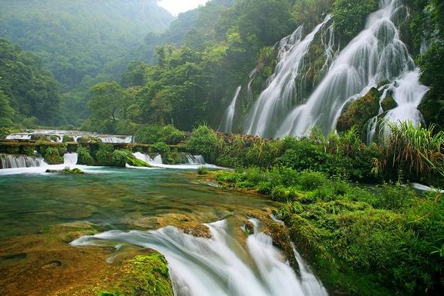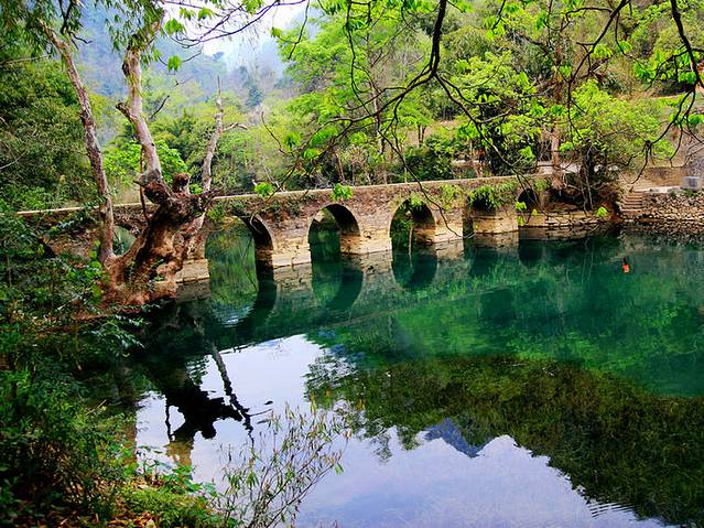 小七孔古桥,位于景区之首,这是一座小巧玲珑的七孔古石桥,桥身爬满藤蔓和蕨类;古色古香的桥下是绿得令人心醉的涵碧潭。