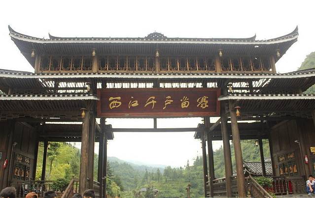 一到苗寨大门,“西江千户苗寨”几个大字映入眼帘,木质结构的门头很是气派