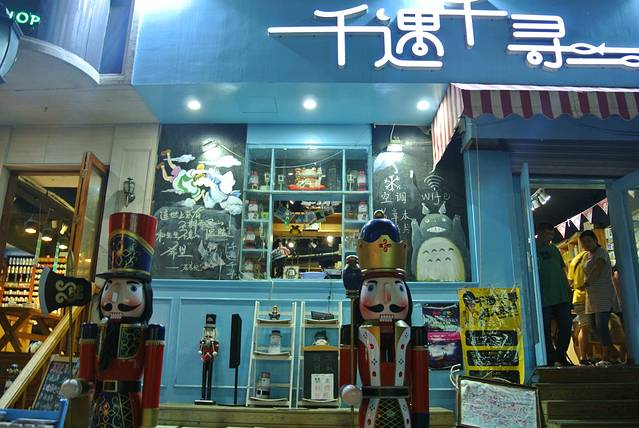 回走的路上偶遇千遇千寻小店,门口就有千寻和白龙的卡通画像,顿时喜欢了,走进店里,各种装饰小物件,留言墙,明信片,龙猫饰品,淡雅的灯光,轻轻的音乐......只逛不买也是一种享受。店门口的拍照牌可以任意的选用,留影,这也是蛮贴心的。